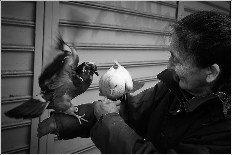 Suzanne nourrit les pigeons du pont de Sète aux halles Laissac